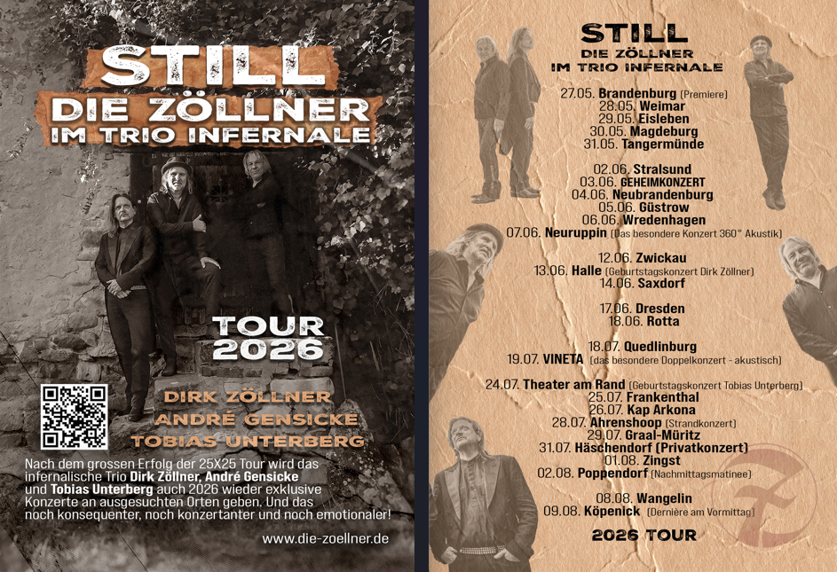 Nach dem großen Erfolg der 25X25 Tour wird das infernalische Trio Dirk Zöllner, André Gensicke und Tobias Unterberg auch 2026 wieder einige wenige exklusive Konzerte an ausgesuchten und besonderen Orten geben. Und das noch konsequenter, noch konzertanter und noch emotionaler! Still- denn auch 2026 verzichtet das Trio wieder auf Pauken und Trompeten und setzt stattdessen auf die Ruhe und die Kraft von Klavier, Cello, Gitarre und auf den unverwechselbaren Gesang von Dirk Zöllner. Still- meint aber auch „immer noch“. Das Trio Infernale ist noch lange nicht am Ende seiner Reise und versteht sich als leisen, aber stetigen Kontrapunkt in einer lauten Zeit. Das konsequente Absetzen von den anderen Projekten aus dem Zöllner Kosmos ist dabei gewollt und hörbar.